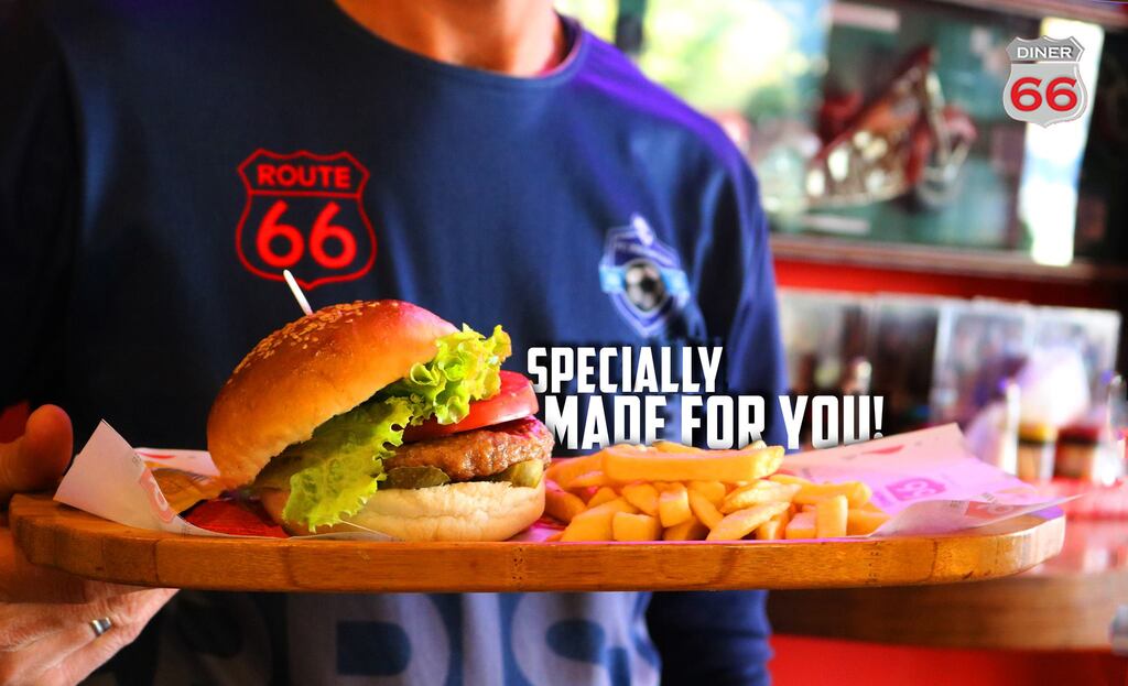 Hamburger me sallatë të gjelbërt, domate, tranguj turshi, keqap, majonez, senf + pomfrit